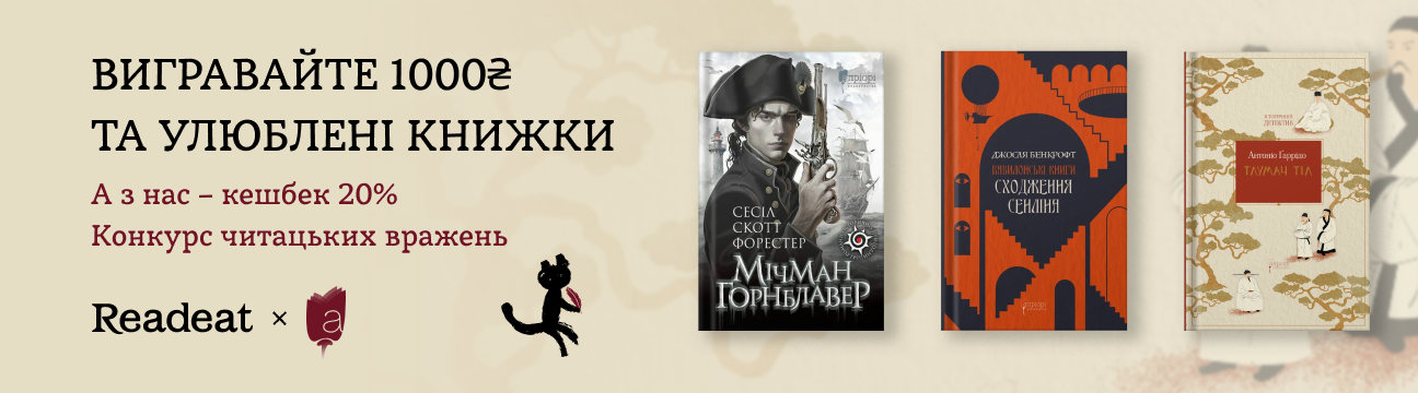 А ще на час проведення конкурсу даруємо цілих 20% бонусного кешбеку за покупку видань від «Апріорі» на Readeat.com та в книгарнях Readeat.